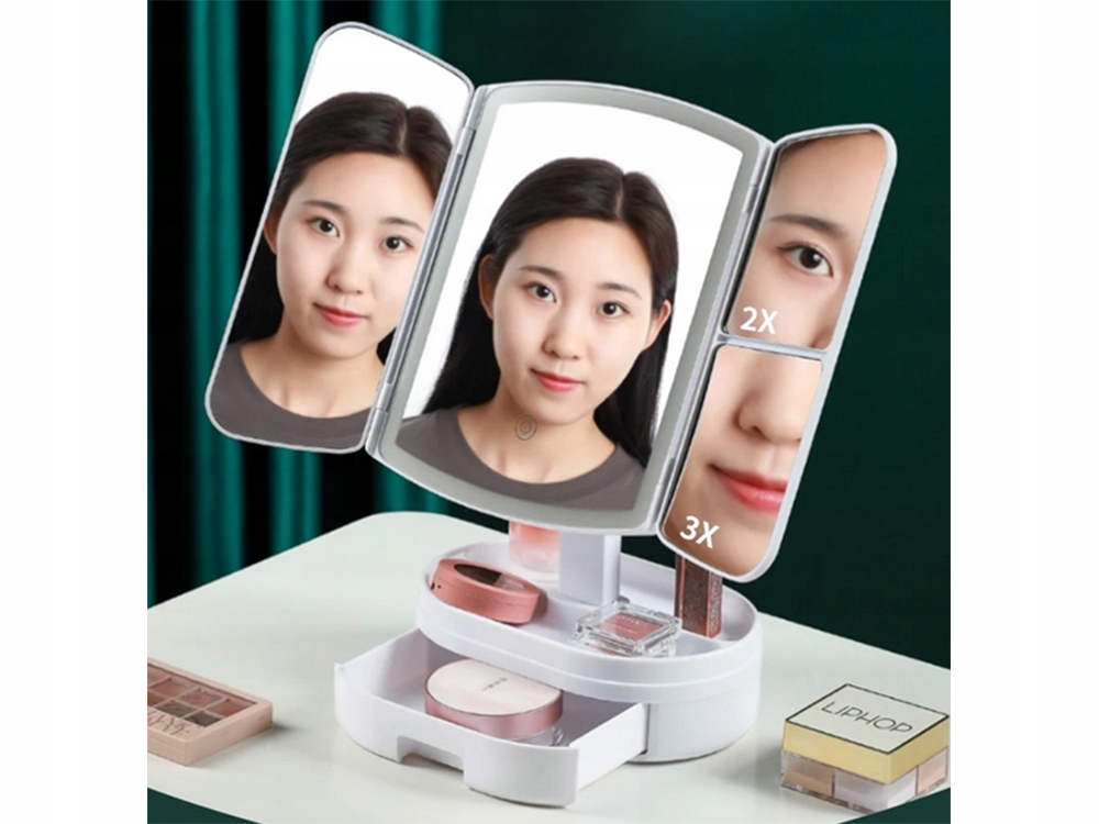 Zrcátko v základně má úložný prostor a přihrádky na různé druhy kosmetických doplňků. To je velmi praktické, zejména při cestování kdy do zrcátka můžeme sbalit nejnutnější kosmetiku.